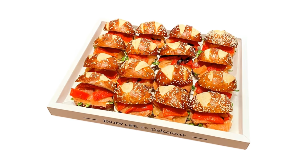 - מגש מיני פרעצל סלמון | גבינת שמנת, פלפל קלוי, סלמון מעושן ורוקט