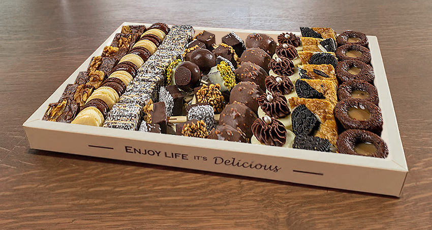 מיקס שוקולדים מסוגים שונים: מיני סופלה שוקולד, בראוניז, בלונדיז, ביס פטיפור, מקרון, טראפלס על מקל, ריבועי שוקולד קוקוס. לבחירה מגש קטן הכולל כ-35 יחידות או מגש גדול הכולל כ-70 יחידות.