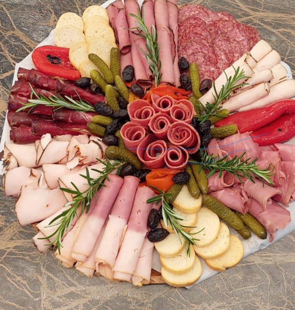 מגש המכיל 6-8 סוגי נקניקים פרוסים במשקל של כ-1.5 ק״ג, כל הנקניקים נפרסים במקום | הנקניקים מגיעים בליווי זיתים ומלפפוני קורנישון | הזיתים מכילים חרצנים | התמונה להמחשה בלבד