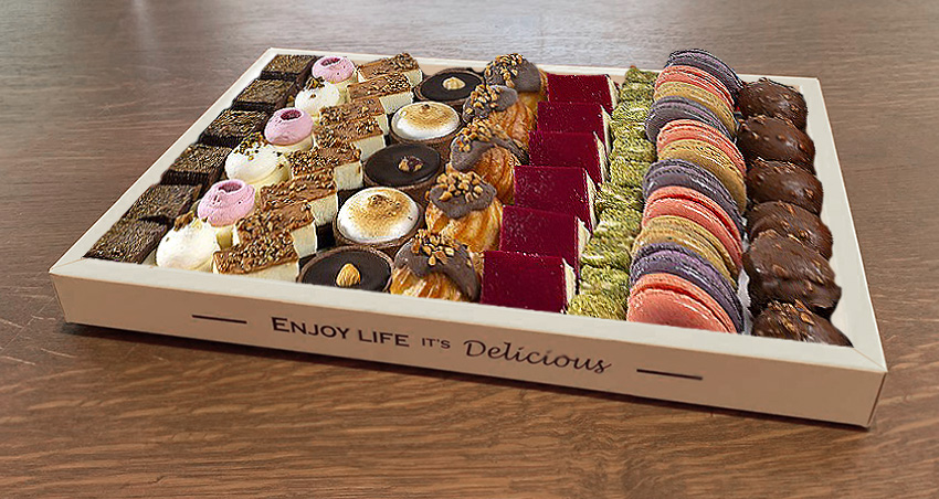 כולל כ-60 יחידות מיני קינוחים ממגוון סוגים: בר שוקולד, ביס פטיפור גבינה, טופי קראנץ, חיתוכי גבינה פירות יער, מקרון בטעמים, מיני בול פטיסייר, טראפלס פיסטוק, פחזניות במילוי קרם וניל בציפוי שוקולד, טארטלטים בטעמים